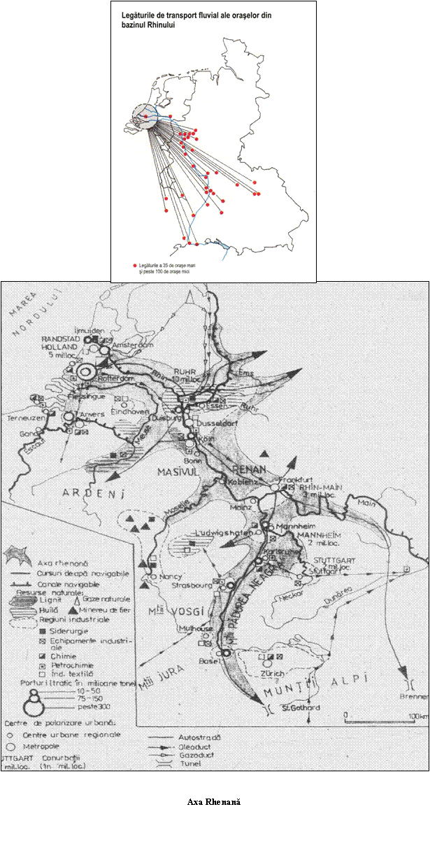 Axa Rhenana (regiune puternic urbanizata si industrializata se inscrie in lungul fluviului Rhin, separand in general munti cu altitudine mijlocie, podisuri si depresiuni sau traversand campii.