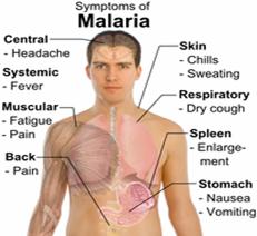 Simptomele de malarie includ febra, frisoane, varsaturi, anemie, hemogoblinuria, convulsii. Clasicul simptom al al malariei este ciclica apritie brusca a frigului, urmata de rigoare(este o agitare care are loc in timpul febrei mari) , apoi de transpiratii si febra cu durata de la 4 pana la 6 ore, odata la 2 zile.