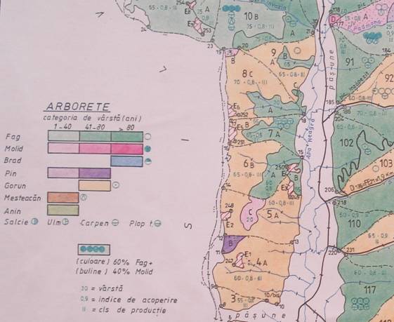 - nuante - pentru categorii de varsta (0-40 ani, 41-80 ani, > 80 ani), cu nuante mai inchise pentru arboretele mai varstnice