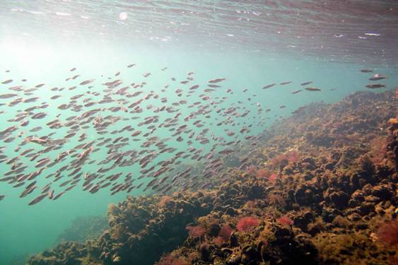 In zona prelitorala se gasesc doua biocenoze importante legate de diferite feciesuri: biocenoza stancilor si bocenoza nisipului. Astfel, stancile si pietrele fixe de la tarmul marii intalnite pana la 28 m adancime sunt pline de crustele racusorului cirriped Balanus si de cochiliile melcului in forma de palarie chinezeasca Patella pontica; in crapaturi se ascund crabi mici (Pachygrapsus). Stancile sunt acoperite cu tufisuri dese de alge brune (Cystoseira), in care se gasesc midiile (Mytilus). Printre aceste aglomerari de alge se ascund pestisori teposi, ca Scorpaena; tot aici se intalnesc alge verzi cu taluri late, in forma de frunze, iar pe portiunile de stanca unde nu exista vegetatie sunt fixate actiniile.