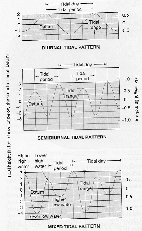 Conform modelului ideal, majoritatea zonelor de pe Pamant ar trebui sa aiba doua fluxuri si doua refluxuri de inaltimi diferite, in timpul unei zile lunare. Dar din cauza modificarii diferitelor adancimi, marimi si forme ale bazinelor oceanice, mareele in multe parti ale lumii manifeste diferite modele. Cele trei modele sunt: diurne, semidiurne si mixt. Acestea sunt sunt prezentate inn figura 1-15.