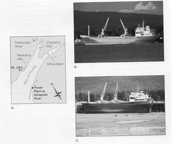 Cu o lungime de 258 Km, golful Fundy are o deschidere larga catre oceanul Atlantic. golful Fundy se despica in doua bazine inguste la capatul nordic, golful Chignecto si bazinul Minas (fig 1-17 A). In golful Fundy, perioada de oscilatie libera- oscilatia care se produce cand un corp este deplasat si apoi i se da drumul- este foarte aproape de perioada de flux si reflux. Interferenta constructiva care rezulta - o data cu ingustarea cu scaderea adancimii golfului catre nord- produce o crestere a energiei mareice la capatul nordic al golfului. Pe langa aceasta golful coteste catre dreapta in emisfera nordica, deci efectul Coriolis se adauga la inaltimea mareei. Acesti factori se unesc ca sa produca o inaltime maxima a mareei in capatul nordic extrem al bazinului Minas.