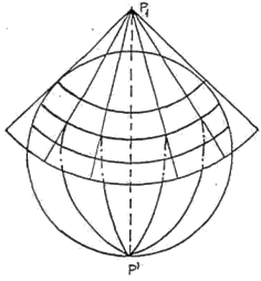a) Proiectii conice la care se utilizeaza suprafata laterala a unui con situat tangent sau secant la sfera terestra. Prin desfasurarea conului meridianele rezulta sub forma unor drepte convergente iar paralele rezulta ca arce de cerc concentrice (fig. 3.1).