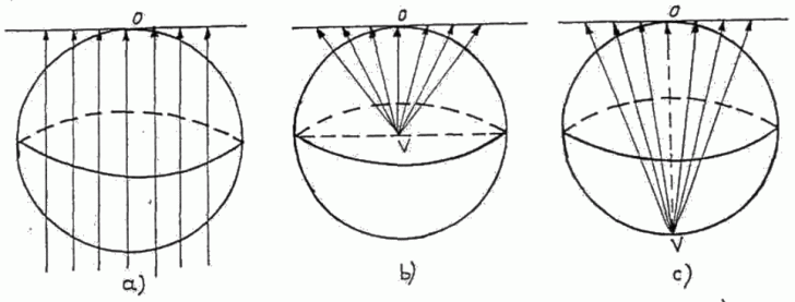 - proiectii azimutale ortografice la care dreptele de proiectie sunt paralele intre ele (fig. 3.3a); -proiectii azimutale centrale, la care dreptele de proiectie sunt razele sferei sau elipsoidului (fig. 3.3b);