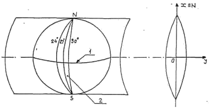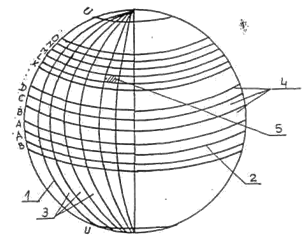 1- meridianul zero ; 2- Ecuator; 3- fus ; 4- zone pe latitudine ; 5- trapezul L-35