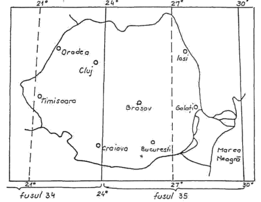 Suprafata Romaniei este cuprinsa in fusele 34 si 35 cu meridianele axiale de 21 si 27 longitudine estica (fig.3.5). In acest sistem de proiectie distantele in lungul meridianului axial nu sufera deformatii dar cele de la marginea fusului sunt deformate; la latitudinea de 45 deformatia in marginea fusului este de 0,67 m pentru o distanta de 1 Km.