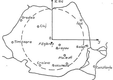 Aceasta proiectie azimutala conforma este utilizata in Romania incepand cu anul 1970 pentru scopuri economice. Punctul central al proiectiei este ales aproximativ la mijlocul teritoriului Romaniei (la nord de orasul Fagaras) avand coordonatele geografice = 46 si = 25, iar planul de proiectie intersecteaza elipsoidul de referinta la adancimea de 3502 m fata de punctul de tangenta. Prin aceasta intersectie rezulta aproximativ un cerc a carui raza este de 201,718 Km, de-a lungul caruia deformatiile prin proiectie sunt nule. in interiorul acestui cerc distantele proiectate sufera deformatii negative iar in exterior deformatii pozitive fata de cele reale (fig. 3.6) Sistemul cartezian al proiectiei are originea in punctul central, axa Ox pe directia Nord iar axa Oy pe directia Est (fig. 3.7). Coordonatele originii sistemului sunt x0 = 500.000 m si y0 - 500.000 m.