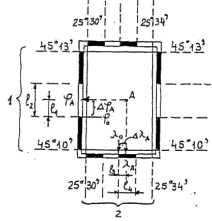 Cadrul geografic permite determinarea coordonatelor geografice (latitudinea φ si longitudinea λ) pentru oricare punct de pe suprafata reprezentata, in modul urmator (vezi fig. 3.9): din punctul respectiv se coboara perpendiculare pe latura inferioara si pe cea din stanga, determinandu-se astfel latitudinea, si longitudinea ale capetelor de segment intersectate de perpendiculare. In continuare se masoara lungimile segmentelor de cadru corespunzatoare unui minut de latitudine (l2) si longitudine (l4) si distantele de la capetele segmentelor intersectate pana la perpendicularele respective, pe latitudine (l1) si pe longitudine (l3). Coordonatele geografice ale punctului respectiv (punctul A ) vor fi: