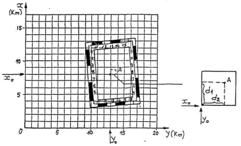 Reteaua de patrate a hartii permite determinarea coordonatelor carteziene plane ale unui punct A, de pe harta astfel (fig. 3.10): din punctul respectiv se coboara perpendiculare pe laturile din stanga si de jos ale patratului in care se afla punctul A. Coordonatele coltului din stanga jos al patratului se pot citi direct pe marginea reprezentarii hartii. in continuare se masoara distantele d1 si d2, intre coltul stanga jos si picioarele perpendicularelor coborate din punctul A. Aceste distante vor reprezenta diferentele de coordonate: