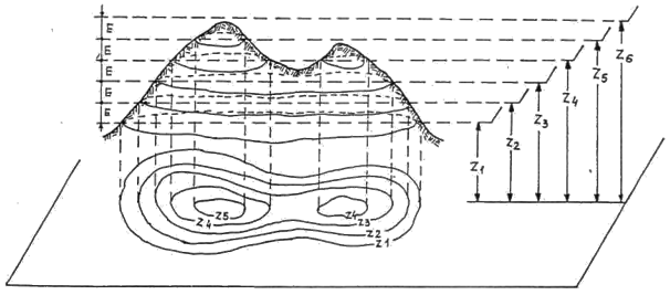 Se considera o forma de relief (de exemplu o colina), planul de proiectie situat la nivelul marii si mai multe plane paralele cu planul de proiectie, situate la altitudini crescatoare cu un interval constant, E. Prin intersectia intre forma de relief si aceste planuri se obtin contururi inchise (fig.3.11) care, pot fi proiectate pe planul de proiectie, rezultand curbele de nivel. Pe fiecare curba de nivel se inscrie valoarea altitudinii planului orizontal, care prin intersectie cu terenul a generat curba respectiva. in acest mod se obtin contururi inchise incluse unul in celalalt (care nu se intersecteaza). Daca se studiaza atent forma in plan a acestor contururi si altitudinile pe care le reprezinta se obtin informatii despre tipul formei de relief si inclinarea terenului in zona respectiva.