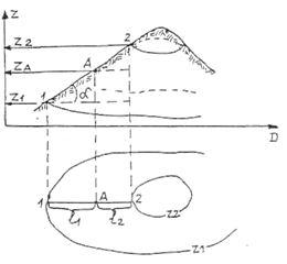 In aceasta situatie, cota punctului oarecare, A se va determina in maniera urmatoare (fig. 3.12): prin punctul respectiv se traseaza pe harta o dreapta aproximativ normala la curbele de nivel vecine, care reprezinta cotele z1 si z2 = z1 + E si care incadreaza acest punct. Se masoara cu o rigla distantele l1 si l2 iar altitudinea punctului A se va calcula cu relatia: