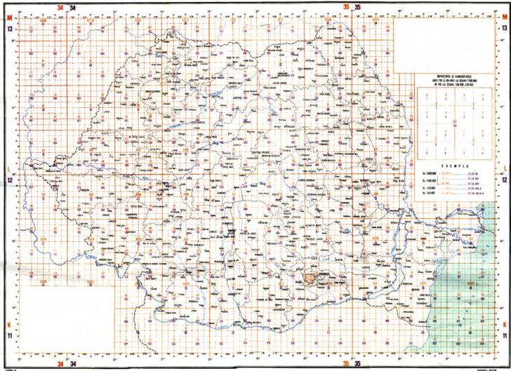 trapezele K-34, K-35, K-36, L-34, L-35, L-36,M-34, M-35, M-36, deci pentru harta Romaniei la scara 1:1.000.000 sunt