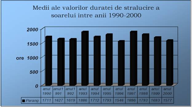 Durata de stralucire a Soarelui este constanta pe perioada celor 10 ani, valoarea maxima fiind de 1886 ore in anul 1997 si cea minima de 1546 ore in anul 1996 (statia Parang).