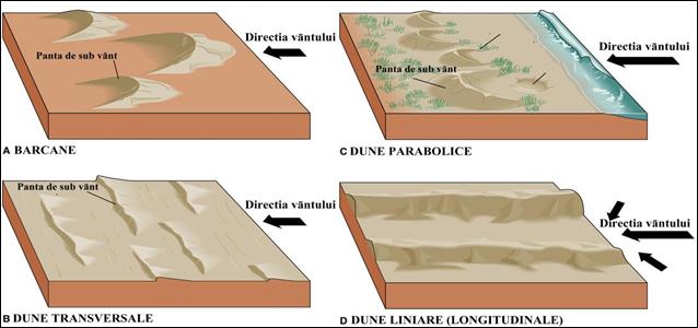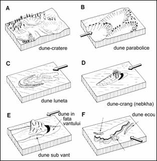 O alta varietate de dune sunt in relatie cu vegetatia, barierele topografice sau localizarea surselor de nisip. Varietati de asemenea dune sunt prezentate in fig. 7. In acumularile de nisip care au fost stabilizate de vegetatie, o serie de perturbari care indeparteaza vegetatia duc la formarea unor microdepresiuni de tip cratere (blowout). Acestea au forma circulara sau eliptica, de obicei de numai cativa metri si s-au format prin deflatia nisipului (fig. 7 A).