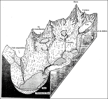 Fig.13. Principalele forme de relief create de ghetarii montani (Selby, 1985)
