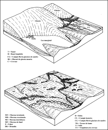 Forme de relief dezvoltate la periferia calotelor glaciare (Thornbury, 1969).