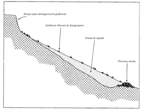 d) Solifluxiunea - termenul de solifluxiune a fost folosit pentru prima data pentru a descrie deplasarea lenta a partii superficiale a unui sol supraumezit. Deoarece in definirea acestui proces nu exista si elemente de restrictie climatica s-a propus termenul de gelifluxiune (Bauling, 1957) care se refera la deplasarea solului pe un substrat inghetat. Procesul de solifluxiune este mult mai activ in zona inghetului peren, deoarece apa rezultata prin dezghetarea stratului activ nu poate patrunde dincolo de limita superioara a permafrostului. In timpul verii solul este supraumezit ceea ce face sa se comporte ca un fluid vascos. In asemenea conditii materialele pot sa se deplaseze chiar pe pante mai mici de 1, dar miscarea maxima se inregistreaza pe pante cuprinse intre 5 - 20 (peste aceasta valoare a pantei solul se dreneaza mult mai repede).