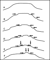 Fig. 13. Stadiile de dezvoltare a teraselor de crioplanatie in roci rezistente la eroziune: (A) - suprafata initiala; (B) - formarea niselor de nivatie; (C) - initierea formarii teraselor de crioplanatie; (D) - stadiul de maturitate in dezvolarea teraselor de crioplanatie; (E) - stadiul initial de formare a suprafetelor de crioplanatie; (F) - martori de eroziune pe suprafetele de crioplanatie. Sagetile indica sensul de modificare al suprafetelor (Summerfield, 1997).