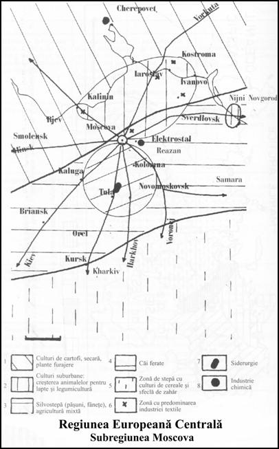 a. Subregiunea Moscova: resurse: carbuni, petrol si gaze, nichel, fier. O industrie complexa: constructoare de masini, siderurgica, chimica, textila si alimentara. Agricultura: cresterea animalelor pentru lapte si carne, avicultura, plante furajere, culturi de cartofi, legume (dezvoltate in jurul marilor centre urbane).