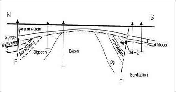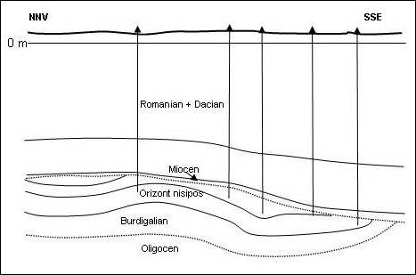 Miocenul este reprezentat de Burdigalian inferior, Burdigalian superior (Helvtian), Badenian, Sarmatian, Meotian si Pontian, in timp ce ultimului ciclu ii apartin formatiunile daciene si romaniene.