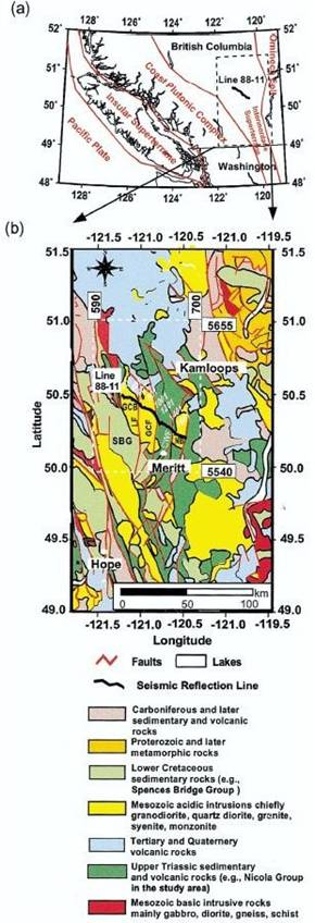 figura 1: a) morfologia geologica a zonei cu mineralizatii Porphyry Copper din GCB. Este prezenta linia de profil seismic 88-11 care va fi descrisa in cele ce urmeaza. b) harta geologica regionala simplificata cu linia de profil seismic 88-11 pe ea. GCB este prezenta in culori galbene. Alta trasatura caracteristica este falia Coldwater (CWF), falia Guichon Greek (GCF), falia Lornex (LF), Nicola batholit (MB), si Spences Bridge group (SBG). |