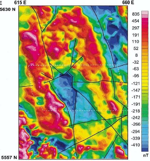 Acest contrast a anomaliei din imaginia data de rezolutia inalta ( figura 4 ) arata o corespondenta buna intre geologie si caracteristicile specifice anomaliei magnetice. Setul de date aeromagnetice prezente sunt date aeromagnetice de rezolutie inalta, achizitionate 3D in grid cu dimensiunile de 35 x 25 km centrat pe GCB in apropierea perimetrului prin care trece linia de profil 88 - 11.