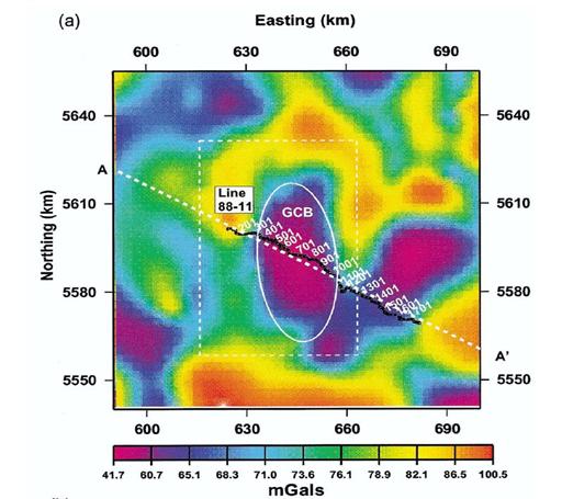 Sursa este o intruziune magmatica de forma eliptica cu latime aproximativ de 30 km si lungime de 70 km. Masuratorile aeromagnetometrice, corelate cu cartarea geologica de la suprafata terenului, au pus in evidenta acumulari de moneralizatii hidrotermale din zona GCB.