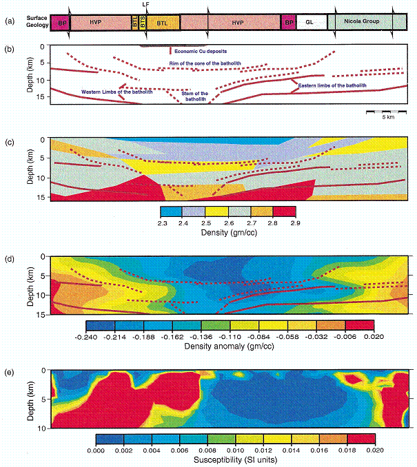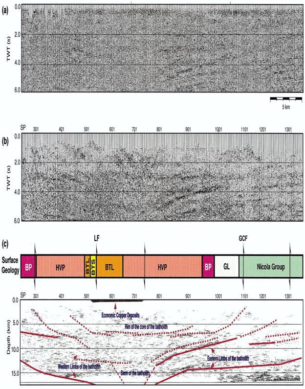 Efectuarea lucrarilor seismice de Lithoprobe's Southern Cordillera Transect au permis noua intelegere formarii orogenului Cordillera din sudul British Columbia ( Cook '95 ). In timp ce sau facut aceste studii, 1300 km de profile seimice au fost inregistrate, la timp dublu - la 18 s ( sub 55 km adincime ). Linia de profil 88 - 11, cu lungimea de peste 80 km, era inregestrata in lungul Highland Valley, care trece peste GCB; CWF ( Coldwater fault ); GCF ( Guichon Creek Fault; LF ( Lornex fault ); NB ( Nicola batholith ) si peste SBG ( Spences Bridge group ). Jumatatea de vest profilului seismic 88-11 incepe cu marginea vestica a batolitului, traverseaza toate faze majore asociate cu batolitul si extinsa peste falia Guichon Creek spre regiunea vulcanica Quesnellia. Ca sursa seismica, au fost utilizate vibratoare care introduceau un sweep de 10-56 hz cu durata de 14 s. Distanta intre surse era de 100 m. Geometria utilizata era asimetrica cu 80-160 split-spread cu distanta intre statii 50 m. Datele au fost inregestrate timp de 18 sec; esantionate la 4 ms; inregestrata pe banda cu 9 piste; statiile folosite aveau 120 de canale DFSV sistems, configurate slave/master.