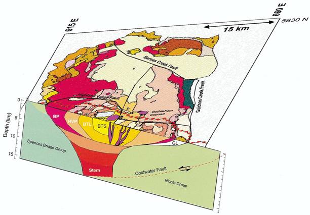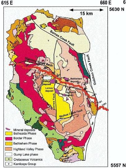 Originea sa este data de procesele tectonice complicate din aceea zona si anume subductia placii pacifice sub scutul canadian formind lantul Cordilieric. Aici avem o activitate vulcanica destul de ridicata, au fost depistati zeci de vulcani stinsi ( inactivi ). Intr-un cuvint este o zona cu conditii perfecte pentru aparitia intruziunilor magmatice si crearea mineralizatiilor hidrotermale. GCB este localizat in intereorul acretiunii Quesnellia, care se combina de la west cu marginea nord - vestica a SUA si a inceput formarea sa acum 200 Mil ani, in jurasic. CGB sunt roci plutonice. Aureola de contact intre intruziunea metamorfozata si mediu are o grosime mai mare de 500 m. Masuratorile radiometrice cu metode K-Ar; Rb-Sr; U-Pb indica ca batolitele si mineralele asociate acestora au fost depozitate intro scurta pereoada prin intruziune intre 196 - 213 mil ani. Structura este traversata de 3 falii importante si anume falia Lornex; falia Guichon Creek si falia Coldwater.