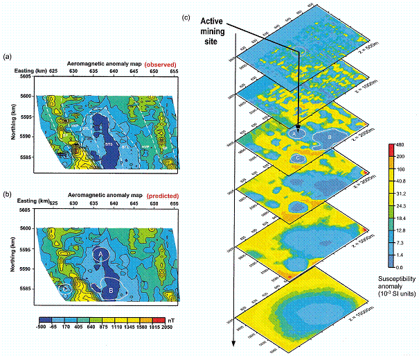 figura 5: a) observatiile de pe harta aeromagnetica de inalta rezolutie cu aproximativele delimitari a fazelor eterogene. Anomalia de minim este asociata fazei Bethsaida care gazduieste cele mai importante depozite minerale cu scop economic. b)harta anomaliei magnetice ascupra careea a fost aplicata modelarii 3D. Perimetrile A,B,C - proectie la suprafata a formei zonei cu susciptibilitate magnetica de minim aflata la distanta de 2000m (c). c) Sectiunea de adincime sa facut in urma modelarii 3D a datelor aeromagnetice, in perimetrul A sau facut lucrari miniere care au confirmat prezenta mineralizatiilor hidrotermale. |