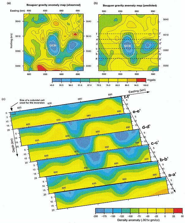 figura 7: a) observatiile de pe harta gravimetrica Bouguer asupra zonei GCB.b) modelarea 3D a hartii gravimetrice; este posibila investigarea distributiei in adincime a anomaliei ceea ce este prezent in figura 7-c. sunt facute profile in lungul perimetrului. c)sectiuni cu distributia anomaliei gravimetrice in adincime deasupra GCB.