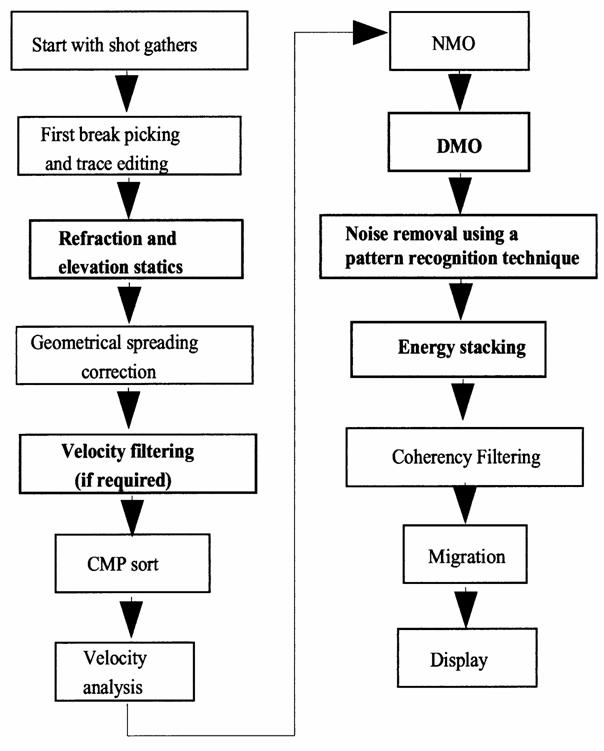 Procesarea include relativ o succeseune normala a prelucrarii datelor: prestack spiking deconvolution, corectii de elevatie si reziduale, editarea traselor, analiza de viteze, CDP stacking, automatic gain control (AGC), atenuarea zgomotului aleator; migrarea.