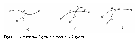 In cazul in care aceasta distanta este mai mare, se va intercala un nod suplimentar si vom avea patru arce (figura 6 c). Toate aceste operatiuni se fac in procesul de topologizare (in Arc/Into comanda de creare a topologiei se numeste CLEAN).