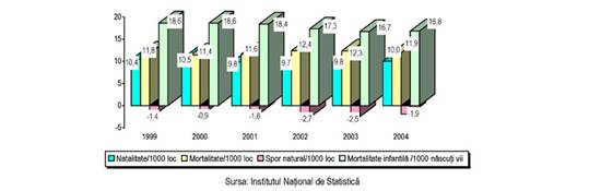 Comparativ cu media UE-15 pentru natalitate, care este caracterizata de o oarecare stabilitate (10,65 nascuti-vii la 1000 locuitori in 1999, 10,63 nascuti-vii la 1000 locuitori in 2001), Romania inregistreaza o scadere semnificativa a natalitatii in ultimii 4 ani de la 10,45 nascuti-vii la 1000 locuitori in 1999 la 9,66 nascuti-vii la 1000 de locuitori in 2002, fara a exista posibilitatea concreta de ameliorare a acestei situatii in viitorul apropiat. De asemenea, aceasta tendinta este similara si la nivelul celor 10 noi state membre, valoarea mediei NSM-10 pentru natalitate fiind relevanta in acest sens (de la 9,92 nascuti-vii la 1000 locuitori in 1999 la 9,20 nascuti-vii la 1000 locuitori in 2002).