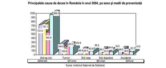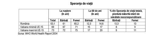 Conform datelor prezentate, in Romania se pierd aproximativ 8 ani prin deces inainte de varsta de 65 de ani, dublu fata de media UE-15. Probabilitatea de deces inainte de varsta de 5 ani in Romania, desi in usoara scadere, prezinta valori de aproximativ 4 ori mai mari decat media UE -15 si de aproximativ 2 ori mai ridicate decat media NSM-10.