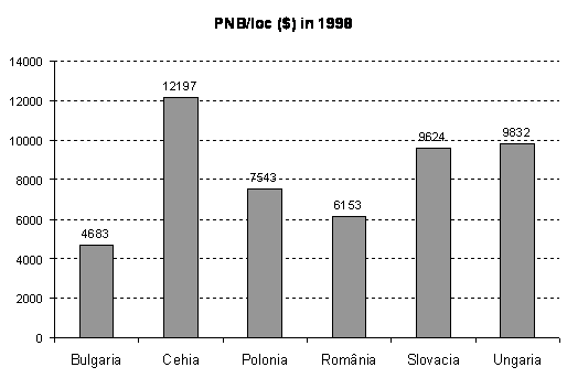 Din Anuarul Statistic al Romaniei din anul 2000 am extras seria care urmeaza, redand nivelul PNB/loc in $ calculat pe baza puterii de cumparare in Romania si alte tari est-europene, in 1998