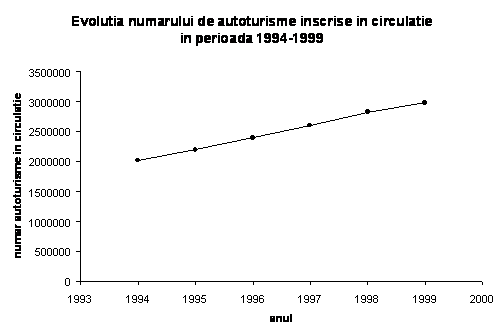 Din Anuarul Statistic al Romaniei din anul 2000 am extras seria care urmeaza, redand numarul total ta autoturisme inscrise in circulatie la sfarsitul anului in Romania in perioada 1994-1999.