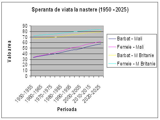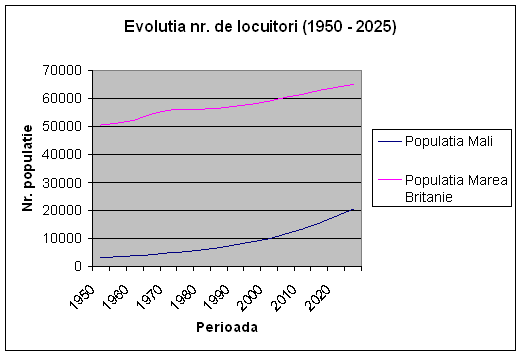 Se poate observa o crestere accentuata a populatiei in ultimile decenii pentru statul Mali, cresterea este exponentiala, tendinta fiind aceeasi si pentru urmatorii ani, spre deosebire de Marea Britanie unde evolutia a fost exponentiala la incepul anilor '50-'70, datorate probabil exploziei demografice in statele vest europene, dupa cel de-al doilea razboi mondial, evolutie cunoscuta in istorie ca baby-boom-ul Europei de Vest, Statelor Unite si Canadei, dupa care cresterea a fost foarte mica.