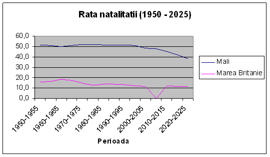 Evolutia natalitatii (valori medii exprimate in numarul de nasteri la 1000 de locuitori) pentru Marea Britanie si Mali este prezentata in fig 2.