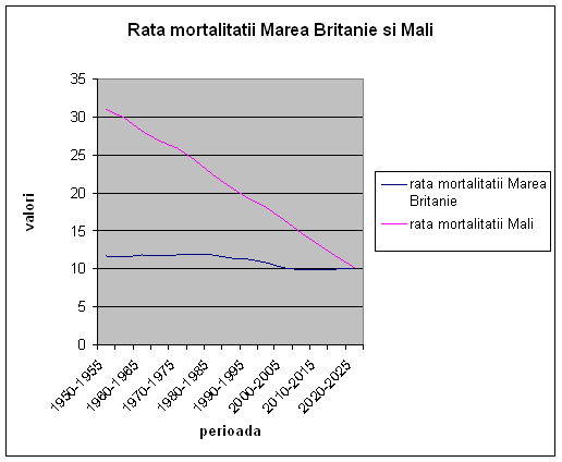 Rata mortalitatii (valori medii exprimate in numarul de decese la 1000 de locuitori) in Marea Britanie si Mali este prezentata in fig. 3
