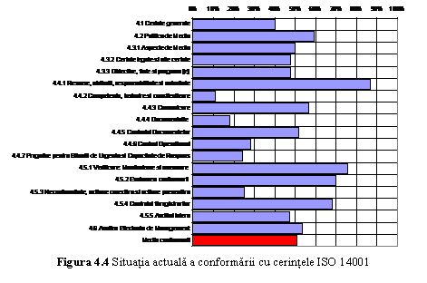 Conformarea sistemului actual de management de mediu cu cerintele standardului SR EN ISO 14001:2005 este apreciata a fi de aproximativ 51%. Articolele din standard insuficient acoperite sunt, in primul rand, cele referitoare la competenta - instruire - constientizare, controlul documentelor, pregatirea pentru situatii de urgenta si capacitate de raspuns, neconformitate, actiune corectiva si actiune preventiva.