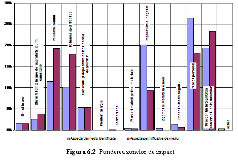In graficul 6.2 au fost prezentate, in paralel, ponderile zonelor de impact pentru toate aspectele de mediu identificate in cadrul ANB si pentru aspectele de mediu care au fost selectate drept semnificative.