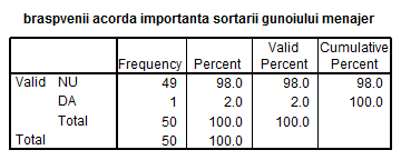 1.Cum apreciaza brasovenii oportunitatea sortarii gunoiului menajer? 2. Isi sorteaza populatia brasovena gunoiul menajer? |