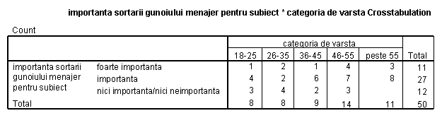 1. Determinarea masurii in care brasovenii considera importanta sortarea gunoiului menajer 2. Cunoasterea atitudinii brasovenilor fata de poluarea datorata gunoaielor menajere. 3. Determinarea celor mai periculoase consecinte ale poluarii mediului datorate cantitatilor mari de gunoi menajer. |