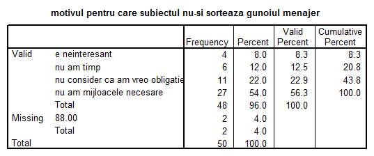 b) "metoda interviului de profunzime" - reprezinta o conversatie, un dialog, o comunicare nondirectiva care presupune formularea de catre cercetator a unui numar mare de intrebari care au rolul de a afla de la subiect, in detaliu, credintele si simtamintele sale in legatura cu tot ce se leaga de sortarea gunoiului menajer, cu scopul de a descoperi motivele de baza ale comportamentului sau.