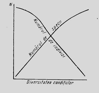 Din afirmatiile acestor principii rezulta asadar ca intre multimea de indivizi si multimea de specii dintr-o biocenoza, exista o relatie de proportionalitate inversa (Fig. 6-37). Explicatia este legata de lupta pentru existenta, de tensiunea interspecific. Astfel, daca exista conditii optime de viata exista multe specii, dar nu pot exista si multi indivizi deoarece va fi o permanenta concurenta intre ei pentru mediu si resurse si astfel nici una dintre populatii nu poate realiza efective mari. Din celalalt punct de vedere, daca sunt conditii de viata mai nefavorabile, aici vor rezista doar specii adaptate la aceste conditii. Fiind putine, lupta pentru existenta aste redusa si niciodata nu vor fi populatii extrem de mari.