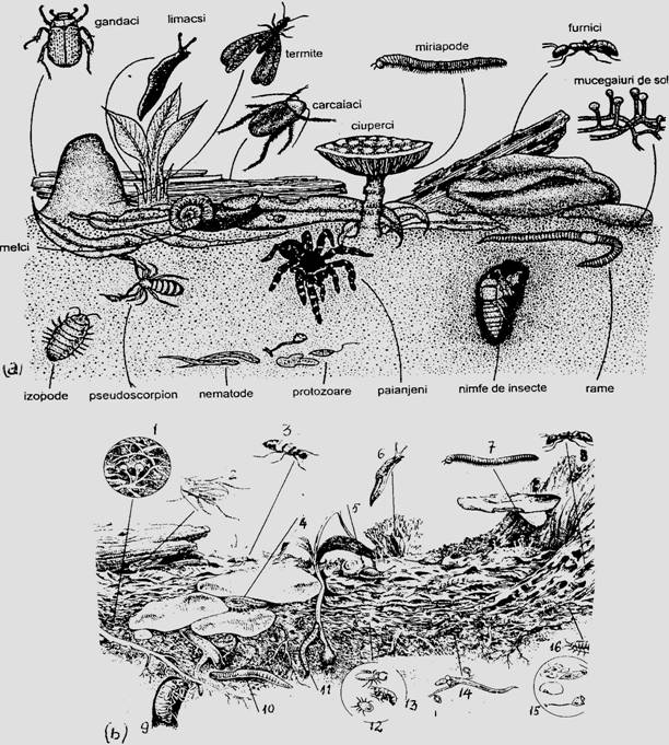Fig. 6-46. Specii reprezentative ale pedofaunei (a, b) (dupa Godeanu si Paraschiv, 2005; Smith, 1974). 1 - ciuperci din sol; 2 - insecte; 3 - coleoptere; 4 - chilopode; 5 - melci; 6 - limacsi; 7 - diplopode; 8 - formicide; 9 - cicade (nimfe); 10 - lumbricide; 11 - viermi sarma; 12-13 - acarieni, pseudoscorpioni si colembole; 14 - fungi si nematode; 15 - protozoare; 16 - izopode.