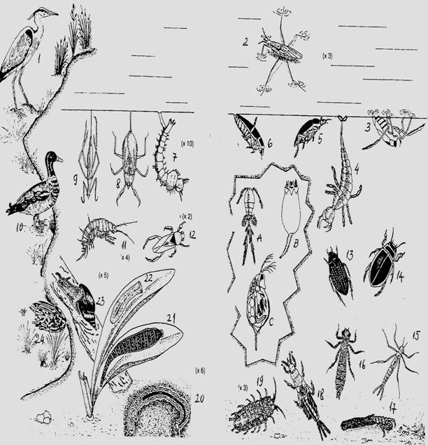 Fig. 6-47. Specii caracteristice unor ecosisteme acvatice si care caracterizeaza anumite etape din succesiunea unui lac. 1 - Ardea cinerea (batlan); 2 - Hydrometra stagnorum (Heteroptera: Gymnocerata); 3 - Notonecta glauca (Heteroptera: Cryptocerata = Hydrocoridae); 4 - Dytiscus marginalis - larva (Coleoptera: Adephaga, carabidae); 5, 13 - Hydrophilus piceus - "boul de balta" (Coleoptera: Poliphaga); 6, 14 - Dytiscus marginalis - adult; 7 - Culex sp. - larva; 8 - Nepa cinerea (Homoptera: Cryptocerata); 9 - Ranatra linearis (Homoptera: Cryptocerata); 10 - Anas sp.; 11 - Gammarus sp. (Crustacea); 12 - Notonecta glauca (Homoptera: Cryptocerata); 15 - Agrion sp. - larva (Odonata); 16 - Eschna sp. - larva; 17 - Pyrganea grandis (Insecta: Trichoptera); 18 - Ephemeroptera - larva; 19 - ...; 20 - larva de Chironomide; 21 - Hirudo medicinalis (Annelida: Hirudinacea); 22 - Planaria gonocephalla (Platyhelmintha: Turbellariata); 23 - Limnea palustris (Mollusca); 24 - Rana sp. (Vertebrata: Amphibia); A, B, C - ciclopi, rotifere si dafnii, speciile cele mai reprezentative ale planctonului unui ecosistem lacustru de tip lac (dupa faurie si colab., 1998).