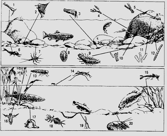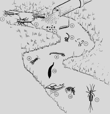 Fig. 6-48. Specii indicatoare ale unui ecosistem acvatic cu apa dulce, de tip rau (dupa Fellrath, 1980; din Faurie si colab., 1998).1 - larva de efemeroptere; 2 - larva de Perla sp.; 3 - Pyrganea grandis - larva (Trichoptera); 4 - alge albastre; 5 - Eristalis tenax - musca de latrina; 6 - Tubifex tubifex (Annelida, Oligochaeta); 7 - bacterii; 8 - larva de Chironomus sp.; 9 - Aselle (?); 10 - Hirudo medicinalis; 11 - Limnea palustris; 12 - Gammarus sp. (Crustacea).