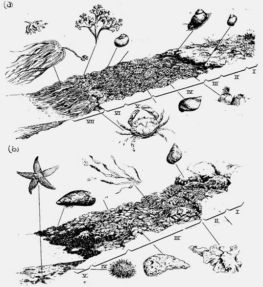 Fig. 6-52. Cateva specii din fauna reprezentativa a Oc. Atlantic de nord (a) si de mijloc (b), zona de coasta, cu substrat stancos (dupa Smith, 1974).